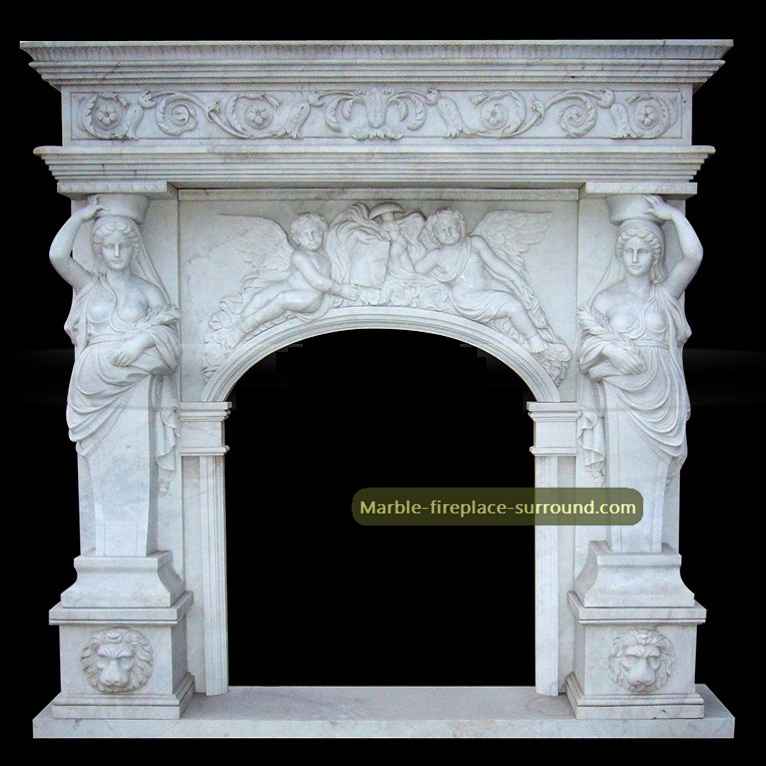 high fireplace mantel arched opening,Twin Corinthian columns corbelled inlaid pilaster. Two female angles statues on top of the arched aperture.Its creamy white marble makes the fireplace surround so elegant , This tall fireplace mantel is suitable for Loft and Villa.