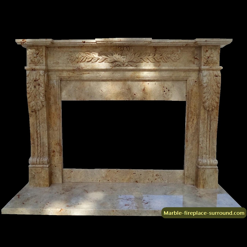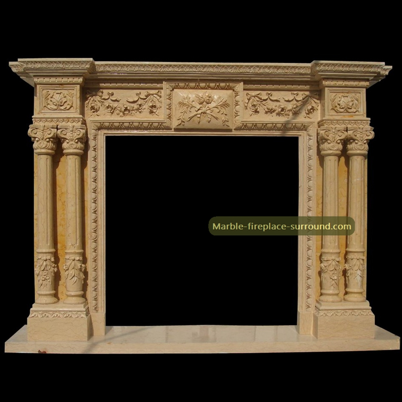 four corinthian columns in front of the beige hand carved marble fireplaces , floral pattern on the central tablet and corner block.If you like this unique marble fireplace surround, welcome to Email us , we will reply you as soon as possible on fireplace surround details and price.