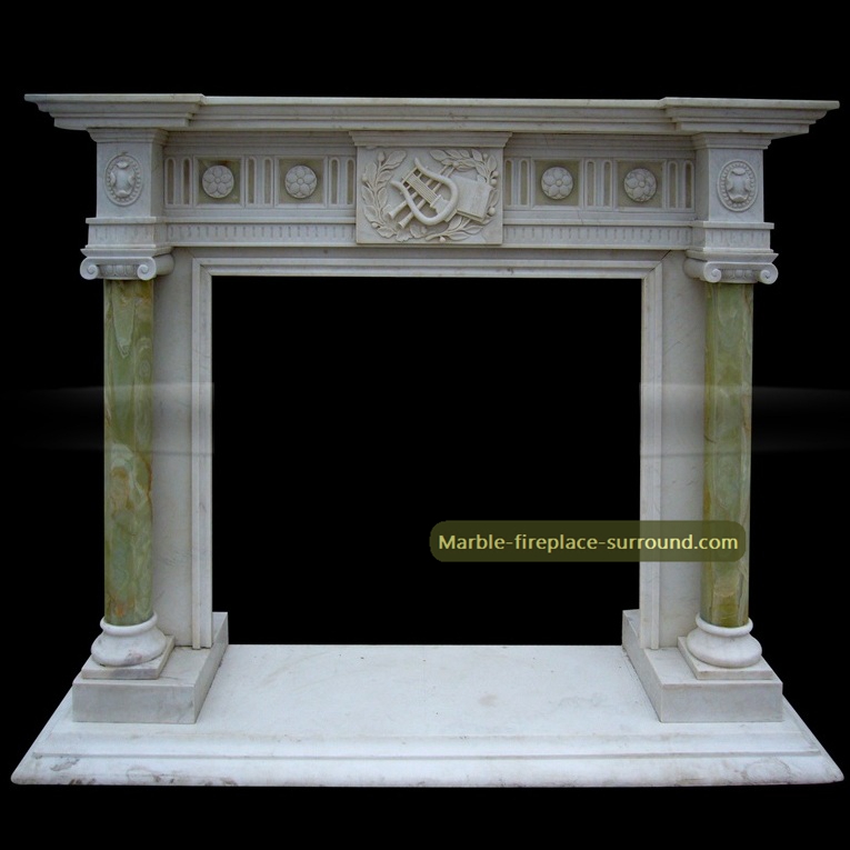 violin relief in the central tablet bespoke marble fireplcae mantels with green onyx inoic columns unique fireplace mantels and surrounds.Exquiste skilled hand carved work but very good chinese factory price shipping directly to your home!