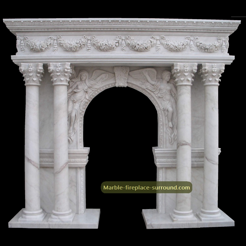 carrara white marble fireplace surrounds with four corinthian marble columnsin the front of the fireplace shelf, two vividly graven angels on the arched opening hearth.Exquiste skilled hand carved work but very good chinese factory price shipping directly to your home!