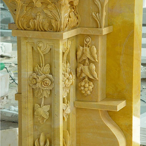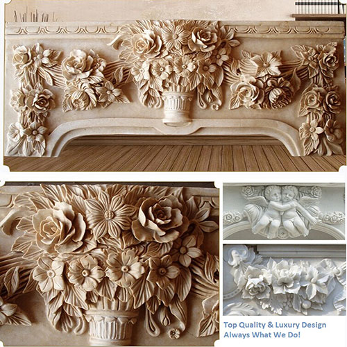 The first photo shows a contemporary white marble caryatid fireplace surrounds with grapevine carving, the second fireplace surround in the photo is English style vintage fireplace mantel with classic ram's masks on the grapevine carving jamb, The third photo is white marble fireplace surrounds with carved four cute cherubim statuary and grapevine .